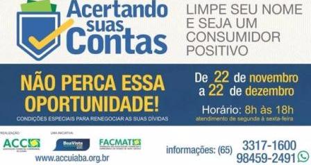 A Associação Comercial e Empresarial de Cuiabá (ACC), em parceria com a Boa Vista SCPC, realiza a partir desta quarta-feira (22.11) a campanha nacional “Acertando suas Contas”. A iniciativa permite renegociações presenciais de dívidas entre consumidores e empresas credoras com condições especiais até o dia 22 de dezembro.